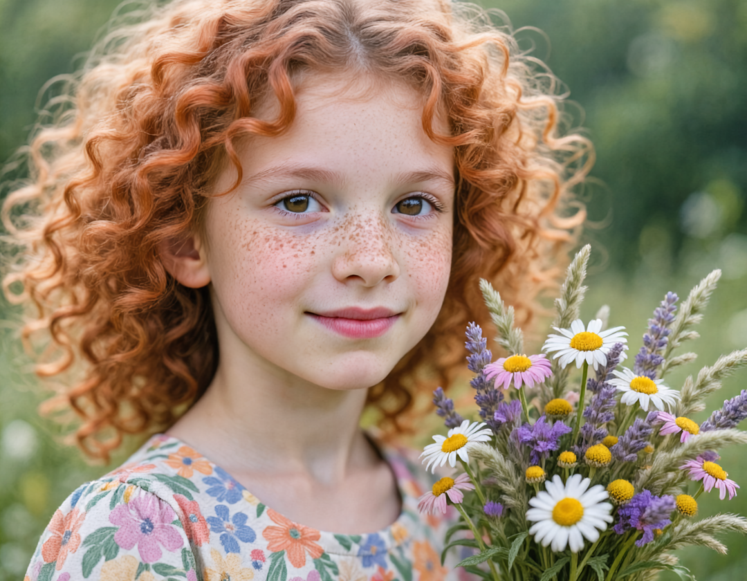 Prompt:A close-up shot focuses on a young girl with vibrant, curly hair and a gentle expression. Her face is characterized by a light dusting of sun-kissed freckles across her nose and cheeks. She wears a dress with a colorful floral pattern and holds a freshly-picked bouquet of wildflowers, including daisies and lavender, against a softly blurred background. The image presents a realistic photography style.