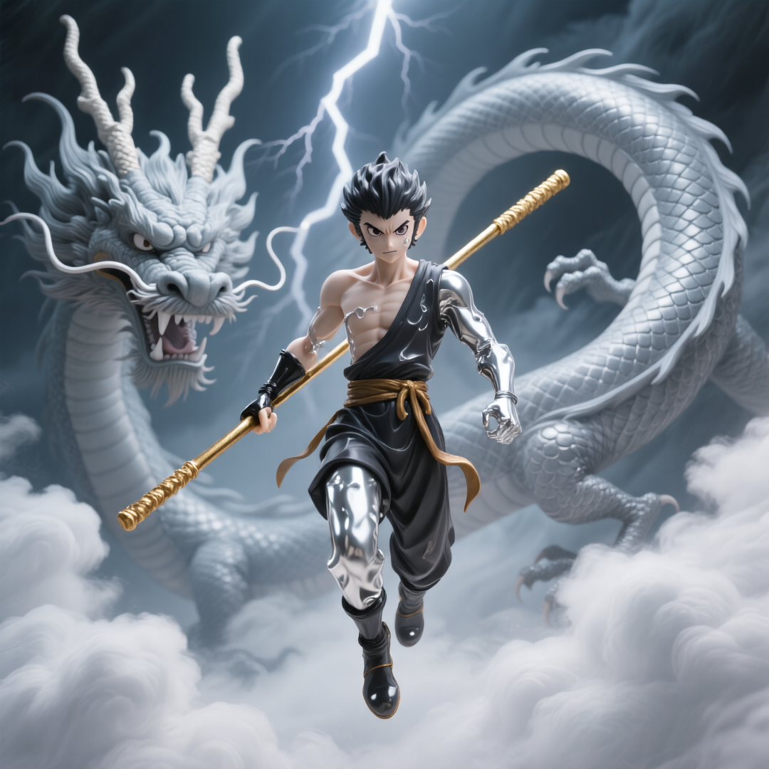 Prompt:一幅超现实主义风格的悟空手办,人物漂浮在半空,身体部分化为液态银色金属,眼神锐利,手拿着金箍棒,背景是一条巨龙在云雾中盘旋,鳞片闪烁光芒,场景充满力量感,空中有闪电。