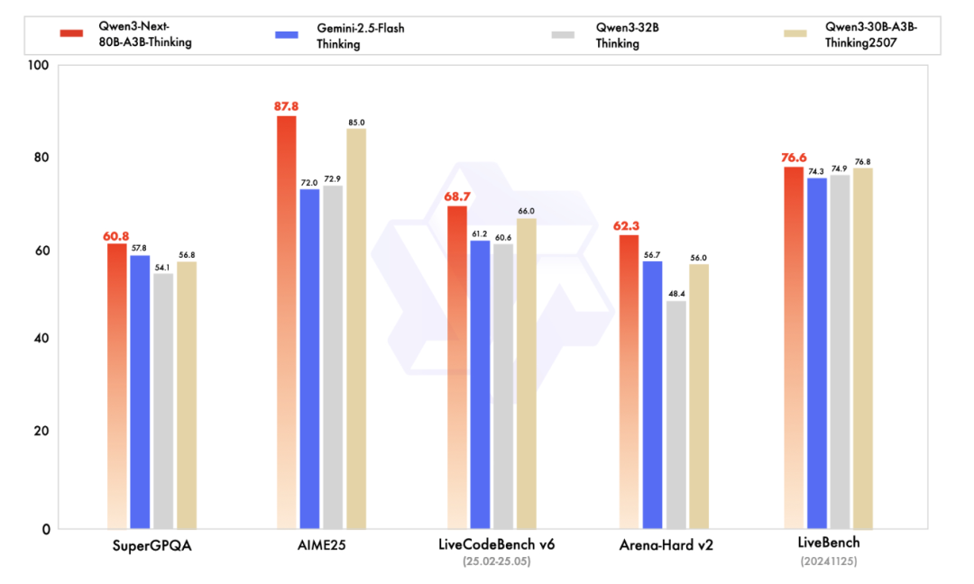 Qwen3-Next-80B-A3B-Thinking:在多项基准测试中超越闭源模型Gemini-2.5-Flash-Thinking。