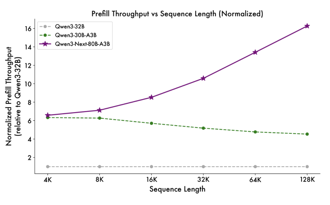 与Qwen3-32B相比,Qwen3-Next-80B-A3B在预填充(prefill)阶段就展现出卓越的吞吐能力: