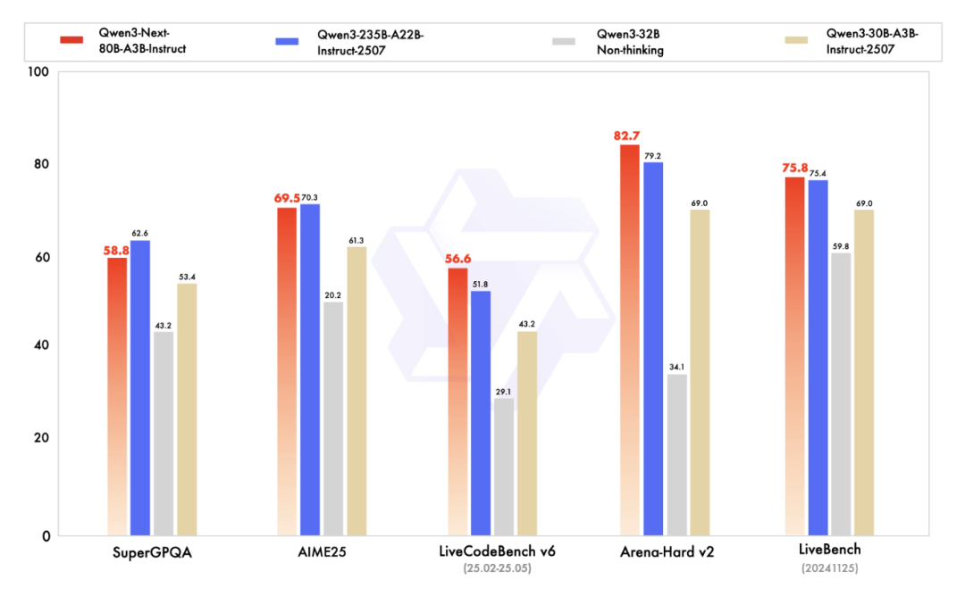 首先,Qwen3-Next-80B-A3B-Instruct的表现显著优于 Qwen3-30B-A3B-Instruct-2507和Qwen3-32B-Non-thinking,并在多数指标上接近Qwen3-235B-A22B-Instruct-2507。