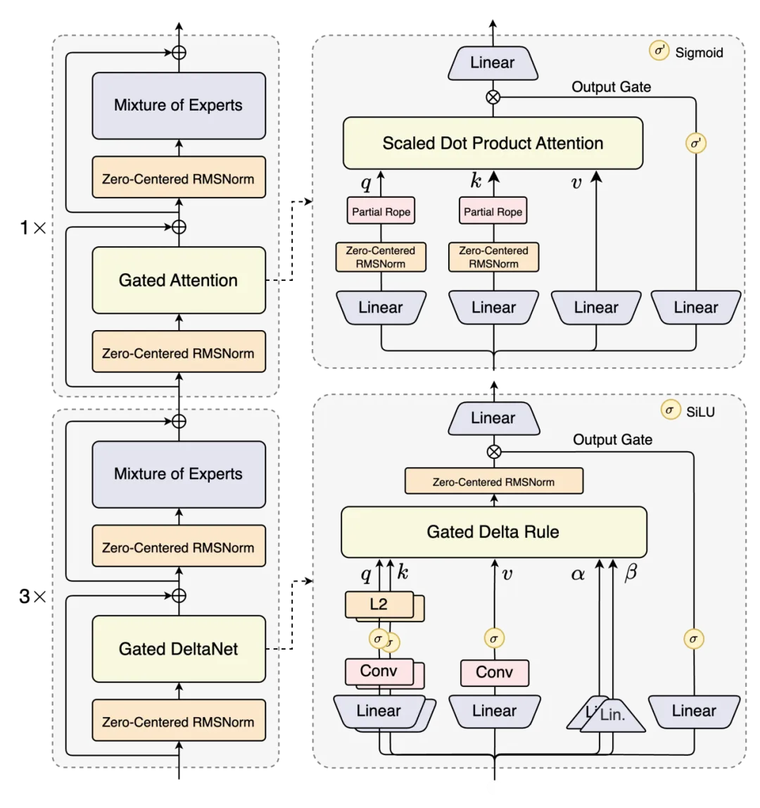 为此,Qwen团队引入Gated DeltaNet,其在上下文学习能力上优于常用的滑动窗口注意力和Mamba2,并在采用3:1的混合策略(75%层使用 Gated DeltaNet,25%层保留标准注意力)时,兼顾性能与效率。