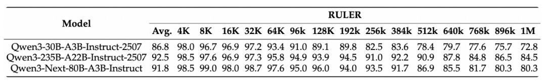 甚至在256 k范围内也优于层数更多的Qwen3-235B-A22B-Instruct-2507,充分体现了Gated DeltaNet与Gated Attention混合模型在长文本处理场景下的优势。