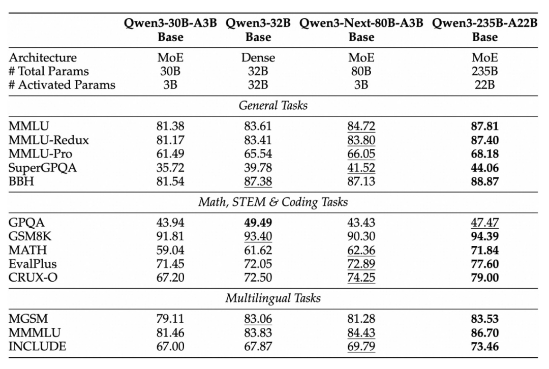 该模型仅使用十分之一的Non-Embedding激活参数,就已在大多数基准测试中超越Qwen3-32B-Base,并显著优于Qwen3-30B-A3B,展现出出色的效率与性能优势。