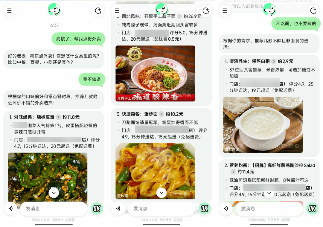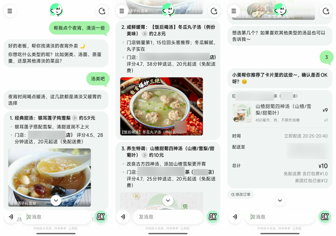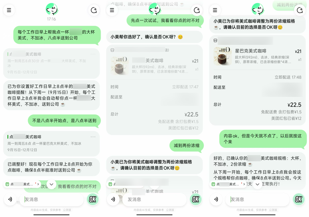不仅是点外卖,像找餐厅、设置日常提醒这样的生活服务,小美统统都能搞定。