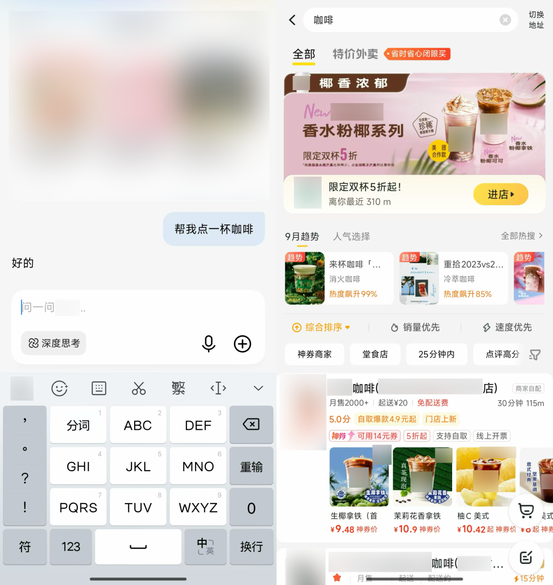我们先试着让手机自带的智能助手帮忙点一杯咖啡,然后画面就跳转到了美团外卖,并且直接展示了“咖啡”的搜索结果。