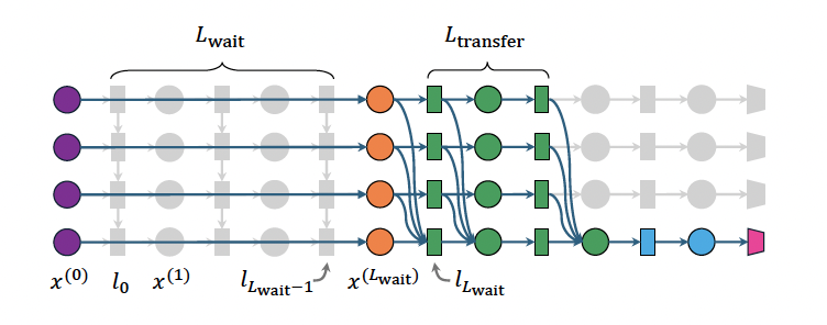 然后,在中间的两层(L_transfer)里,它们就将信息传递给最后一个token。