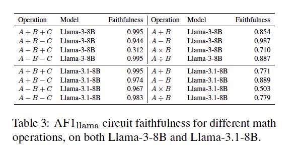 尽管忠实度普遍低于Llama,但对二元运算任务的子图仍能恢复超过一半的原始模型准确率。
