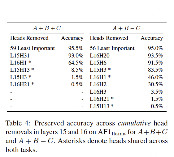 研究表明,仅少数注意力头对算术计算关键,即使移除近60个头部,模型仍能保持约95%的准确率,表明大部分注意力头冗余,而关键头集中在少数层。