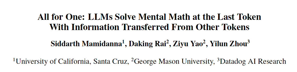 最近,来自加州大学圣克鲁兹分校、乔治·梅森大学和Datadog的研究人员发现:在心算任务中,几乎所有实际的数学计算都集中在序列的最后一个token上完成,而不是分散在所有token中。