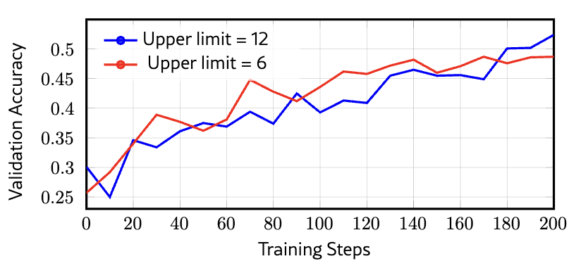 为了直观展示增加训练轮次的效果,研究团队对比了6轮交互上限和12轮交互上限在VisualProbe-Hard数据集上的准确率。结果显示:较低轮次上限(6轮)在初期进步更快,但训练约150步后就会停滞不前;而较高轮次上限(12轮)虽然前期学习速度较慢,最终却能达到更优异的性能水平。