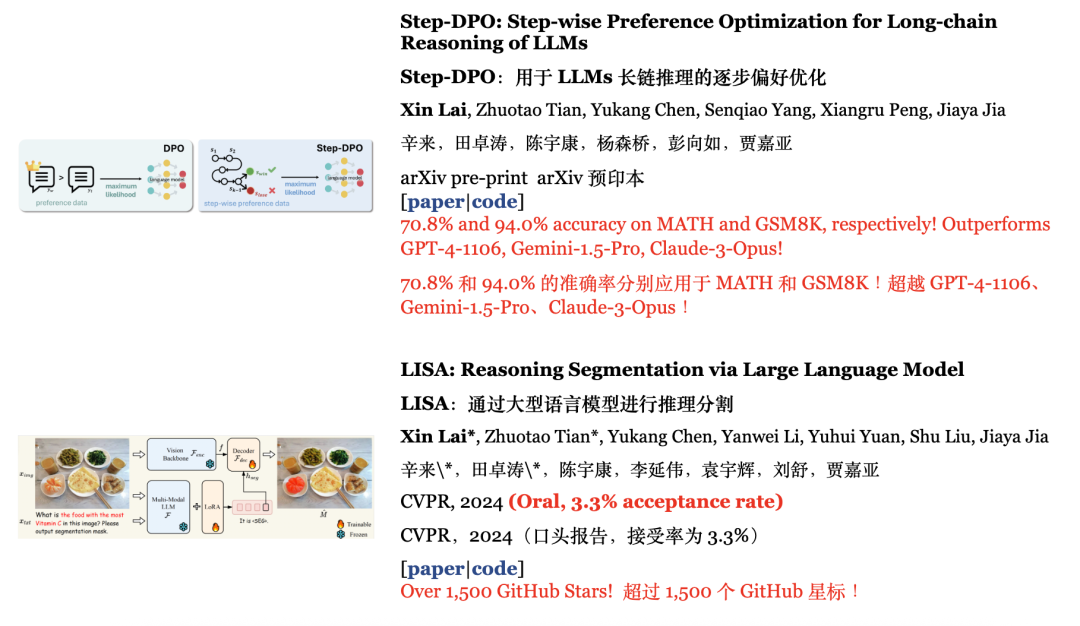 博士期间,他作为第一作者参与的Step-DPO项目在MATH和GSM8K分别获得了70.8%和94.0%的准确率;LISA项目在GitHub上得到超过1.5k(现2.4k)星标。