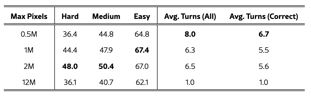 首先,降低最大像素限制。基础模型的上下文长度被限制在3.2万token,当默认图像预算约为1200万像素时,可允许的交互轮次会因上下文限制而大幅减少,这阻碍了模型在困难任务上进行试错探索。