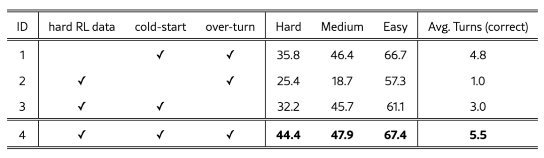 上表的实验2和实验4表明,冷启动SFT对于多轮工具使用至关重要:没有它,性能会崩溃。