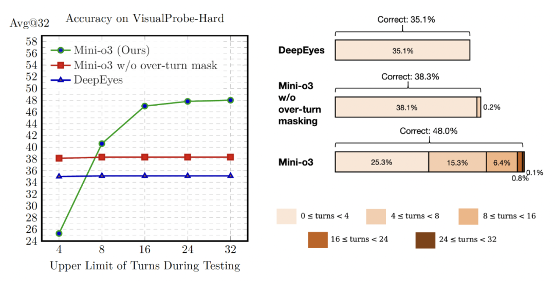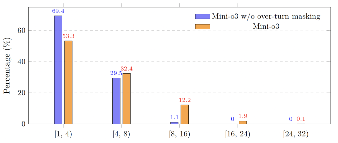 研究团队将这些提升归因于Mini-o3能够维持更复杂和更深的推理轨迹。