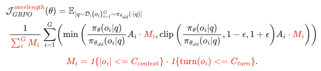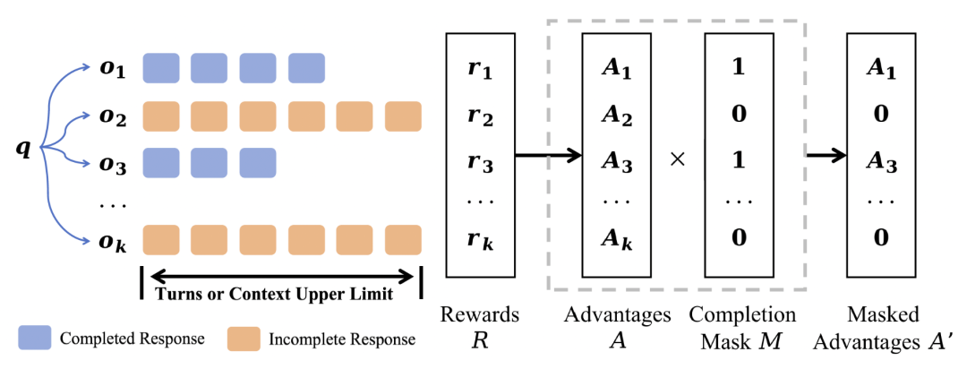 具体来说,除了在标准GRPO中定义的奖励【r】和优势【A】之外,研究团队引入了一个完成掩码【M】,用于指示回复是否成功终止。然后计算掩码后的优势