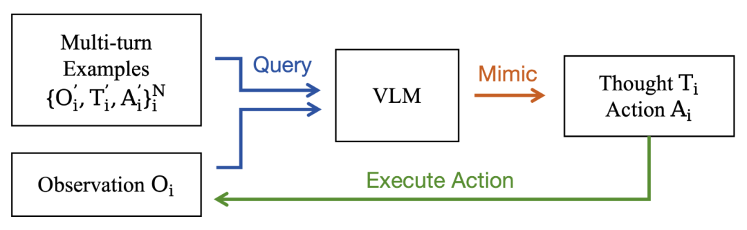 为生成高质量、多样化的多轮推理轨迹,研究团队选取少量人工构建的示范样本,通过上下文学习方式提示现有VLM进行模仿。