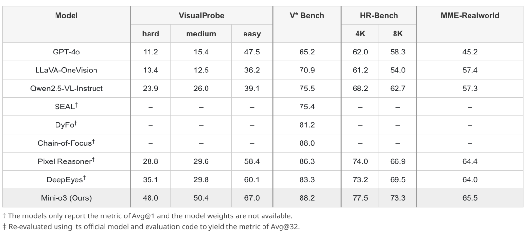 为确保评估的稳健性和说服力,研究团队在VisualProbe、V*Bench和HR-Bench上评估所有模型。在所有数据集上,Mini-o3均实现了最先进的性能,显著优于其他开源基线。