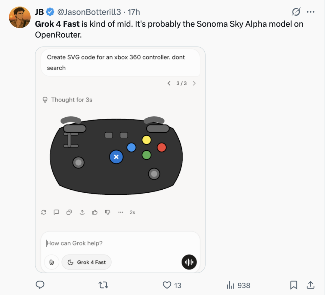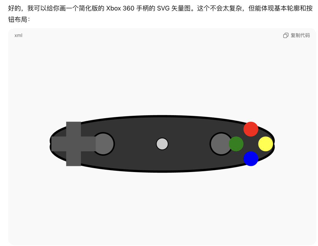 例如,有网友让Grok 4 Fast生成一个Xbox 360 手柄的SVG代码,它的表现相当抽象……