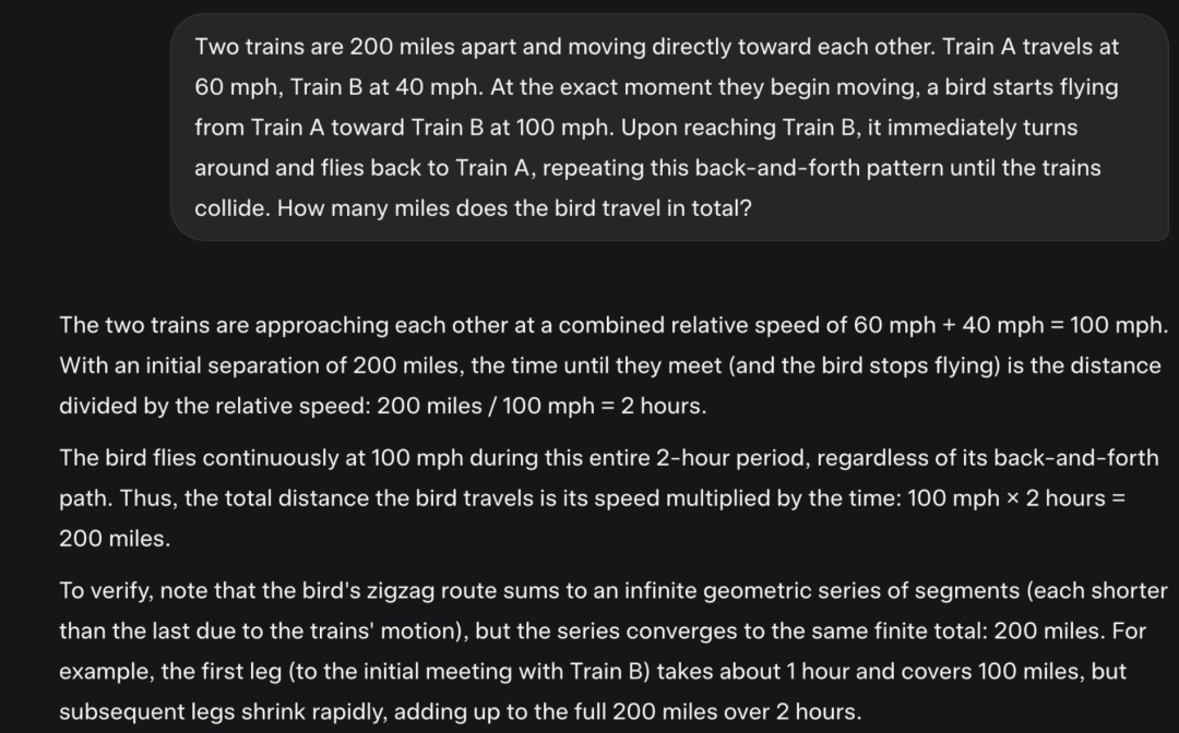 第二道题:两列火车相距200英里,正向彼此驶来。A 列火车速度60mph,B 列火车速度40mph。在火车刚开始移动的那一刻,一只鸟从A火车出发,以100mph 的速度飞向B火车。鸟到达B火车后立即掉头飞回A火车,如此往返,直到两列火车相撞。问:鸟总共飞了多少英里?