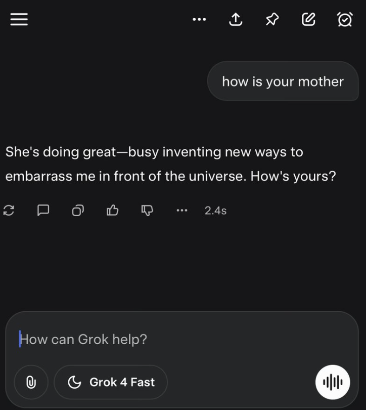 (网友:你妈妈怎么样?Grok:她好着呢,除了让我在全世界面前现眼没别的,你妈呢?)