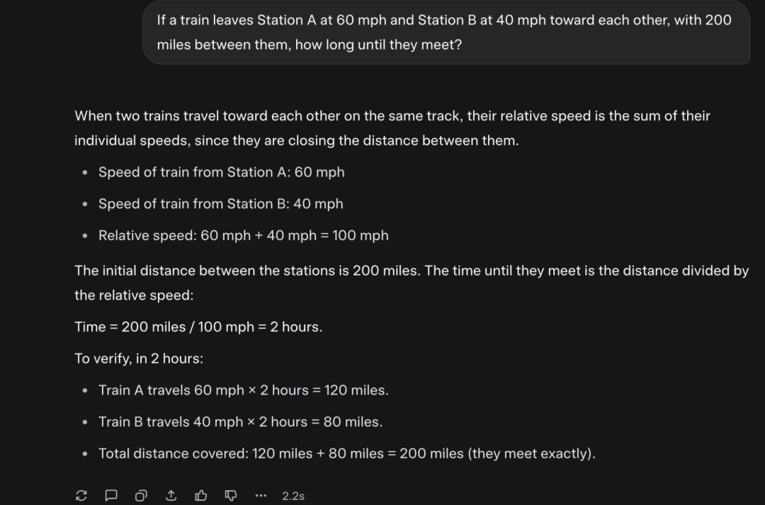 第一道题:如果一列火车从A站以每小时60英里出发,另一列火车从B站以每小时40英里出发,互相驶向对方,A、B两站之间相距200英里,它们多久会相遇?