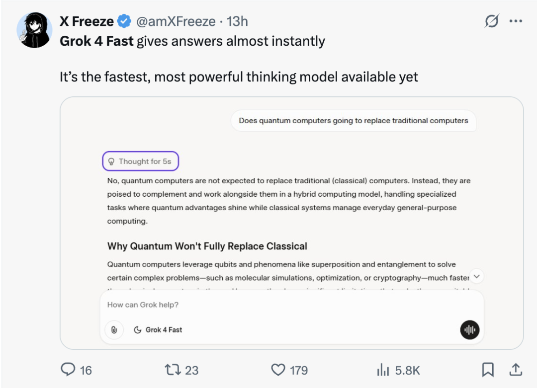 除了编程题,像“量子计算机什么时候取代传统计算机”这样的问答,Grok 4 Fast也能瞬间给出答案。