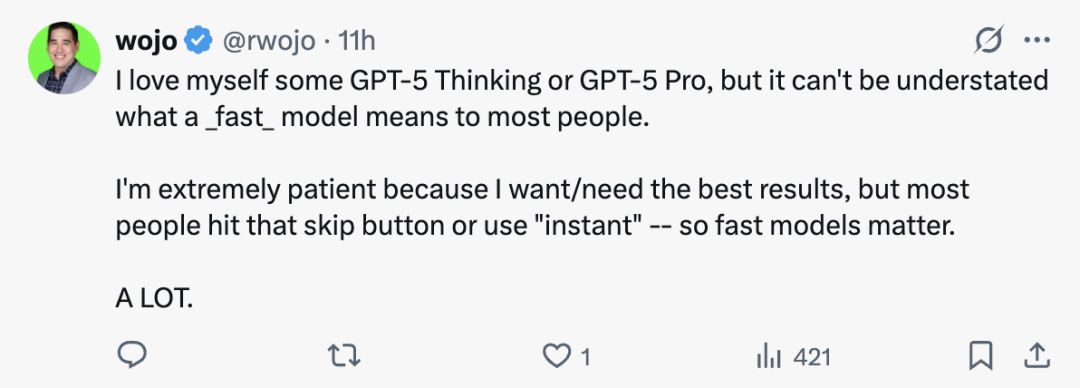 网友的看法也很贴切:我很喜欢GPT-5 Thinking或GPT-5 Pro,但对大多数人来说,速度才是关键——他们更倾向于跳过或用“即时”模式,所以快速模型非常重要。