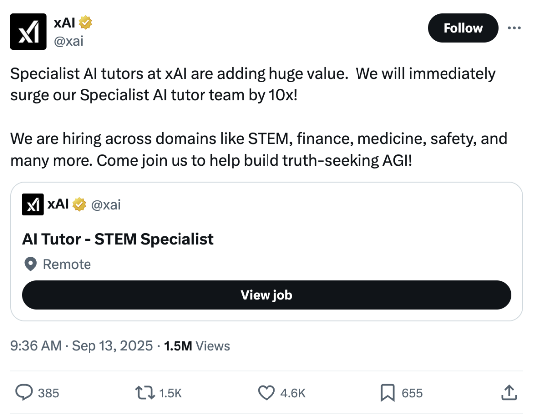 然而,此次xAI从通用数据标注员向专业数据标注员的大角度倾斜,可能反映出马斯克恰恰押注于相反的观点——质量重于数量。