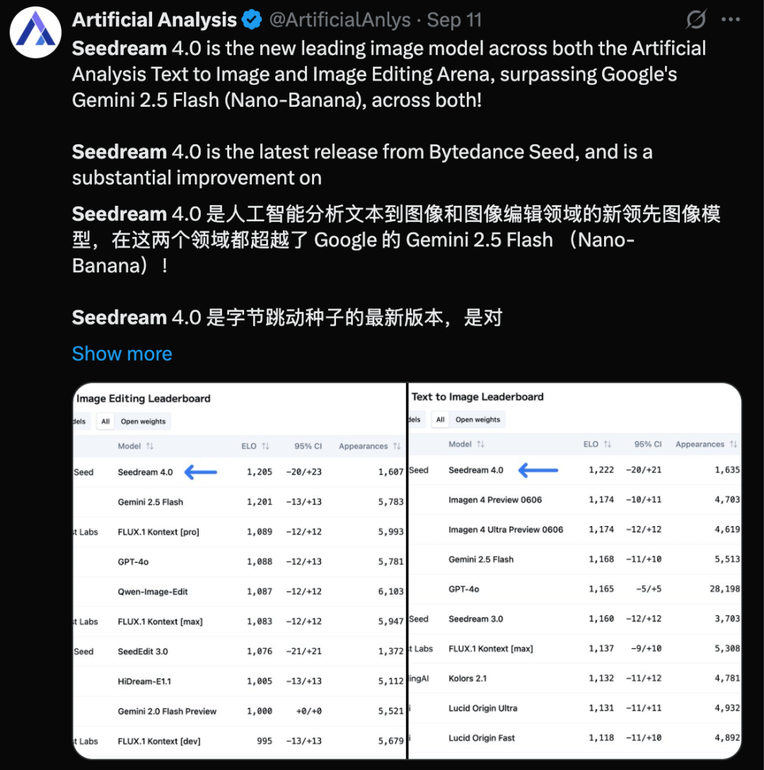 模型一经推出就强势拿下Artificial Analysis的文生图和图像编辑双榜第一,超越了谷歌的Nano Banana。