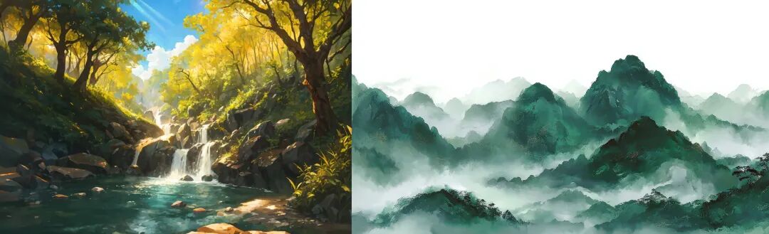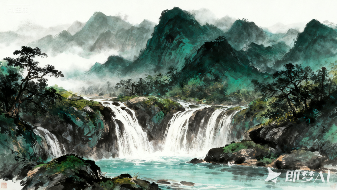 秒哇!直接成名家画作了,既保留了第一张参考图里的瀑布、岩石等元素,也巧妙融入了第二张图的水墨意境。