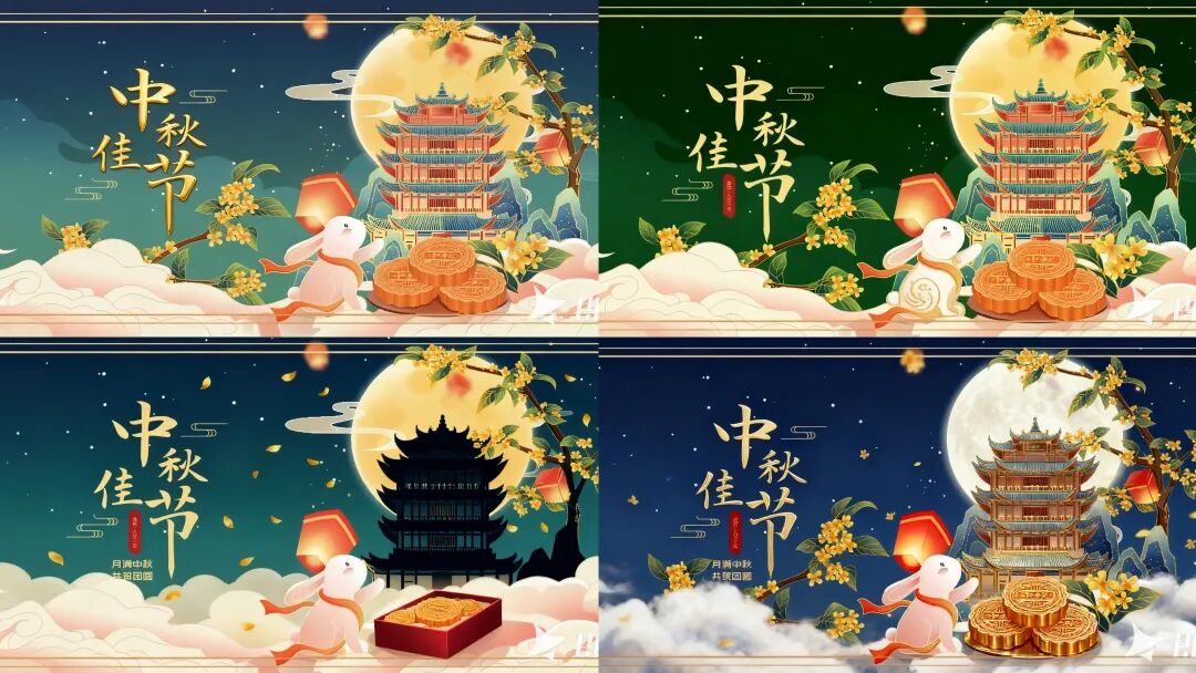 第一张图整体基调不变,只将字体样式改得更有阴影棱角;第二张图将楼阁改成暗色调,增加一些飘洒的花瓣特效,月饼也成了礼盒装;第三张图换成了墨绿色渐变背景,小兔子身上也加了点纹样点缀,让画面更丰富;第四张图的背景则改成了深蓝色的夜晚,月饼上还镀上了一层金属光泽,贵气!