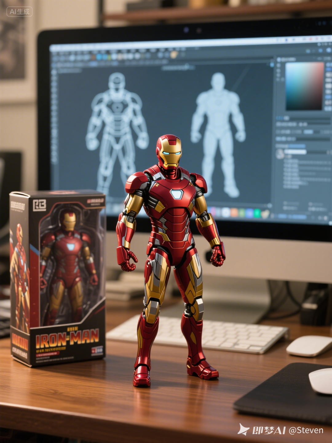 钢铁侠精致手办模型,红色金色装甲配色,站立在现代木质办公桌上,背景电脑显示器展示3D建模软件界面,屏幕显示钢铁侠角色设计,左侧放置手办包装盒,温暖室内灯光,现实主义摄影风格,产品展示效果,3:4竖版构图,专业工作环境氛围。