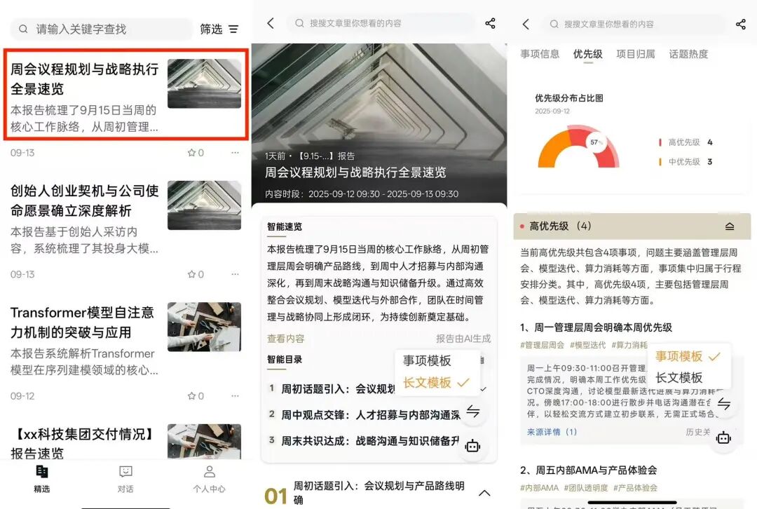 其中,长文模式能够对工作进度进行详细分析,事项模式更倾向于直接列出整个项目中某一事项的优先级。
