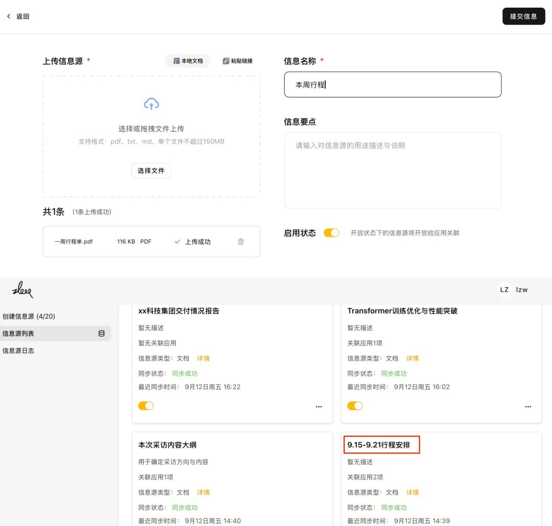 首先,把我们需要生成报告的信息源上传到后台,支持本地文档上传,也可以直接接通飞书、钉钉等内部IM系统。