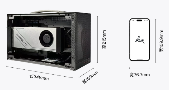没错,整个机箱就A4大小,跟iPhone 15 Pro Max对比起来是这样的: