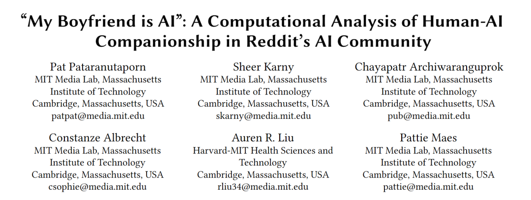 而现在,麻省理工和哈佛大学的研究人员通过分析Reddit子版块r/MyBoyfriendIsAI上的帖子,完整揭露了人们寻找“AI男友”的动机、具体相处过程等问题,并得出了一系列有趣发现: