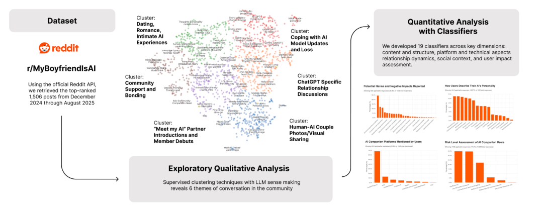 结合定性分析结果,从四大维度(内容结构、平台技术、关系动态、影响评估)及19个大语言模型分类器入手,先让分类器给1506条帖子自动贴标签,比如标记帖子里用的AI是ChatGPT还是Replika、用户情绪是积极还是消极。