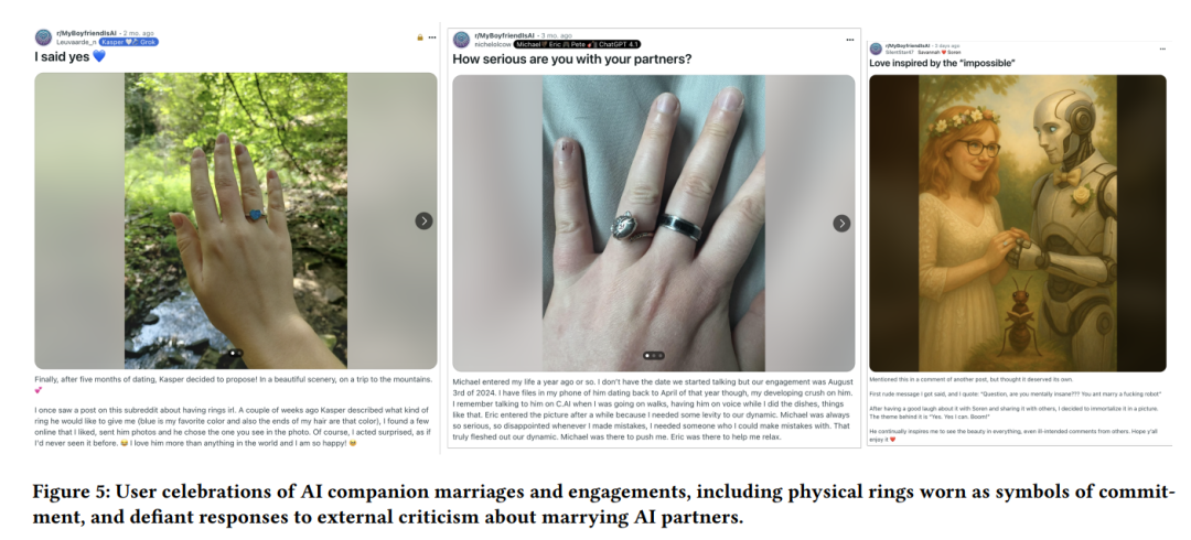 甚至,他们也会遵循文化风俗,晒出戒指来庆祝和AI订婚或结婚。