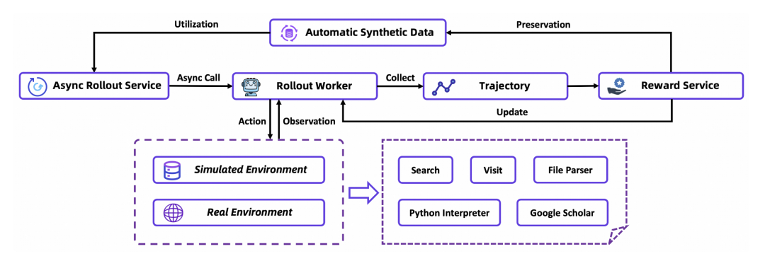 稳定高效的工具沙盒:为了确保在智能体训练和评估期间对工具的稳定调用,我们开发了一个统一的沙盒。该沙盒通过缓存结果、重试失败的调用以及饱和式响应等改进来高效地处理并发和故障。这为智能体提供了快速且鲁棒的交互环境,可以有效防止工具的错误响应破坏其学习轨迹。