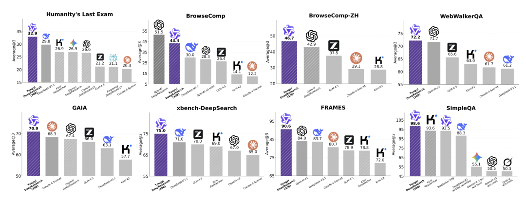 相比于基于基础模型的ReAct Agent和闭源Deep Research Agent,这个30B-A3B轻量级模型Tongyi DeepResearch在HLE、BrowseComp-zh、GAIA等多个权威评测集上取得SOTA成绩,超越了OpenAI Deep Research、DeepSeek-V3.1等Agent模型。