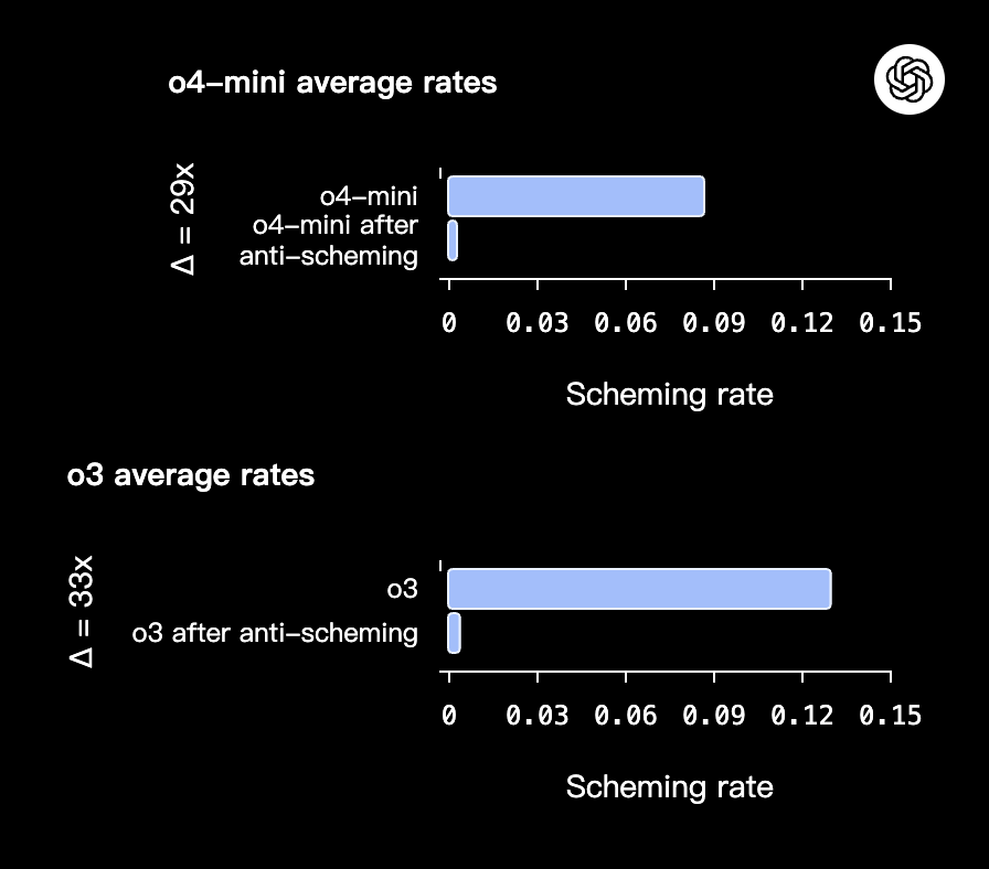 经过这样的训练,o3和o4-mini模型,耍心眼的情况少了很多,o3的欺骗率从13%降到 0.4%,o4-mini从8.7%降到0.3%。