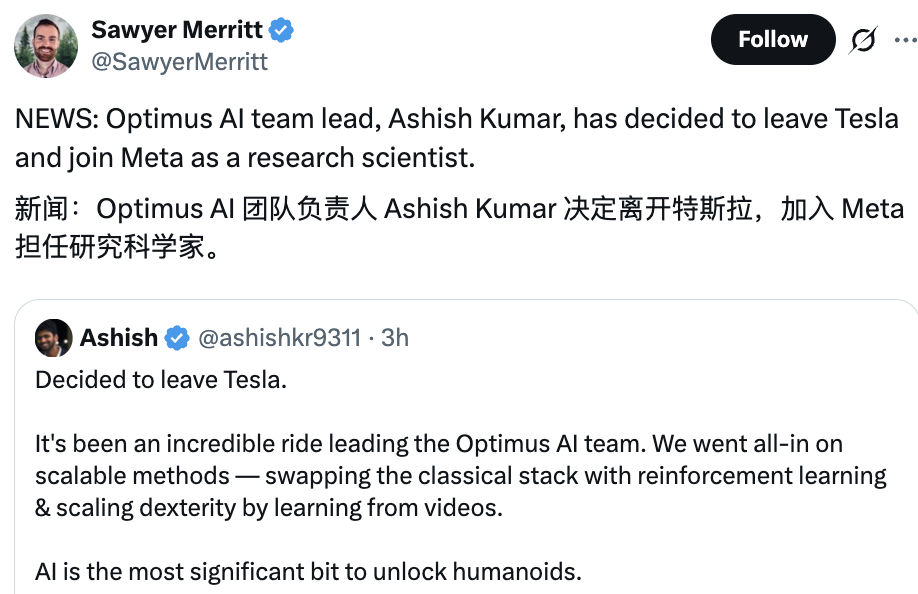 这不?Optimus AI团队负责人Ashish Kumar决定离开特斯拉,加入Meta担任研究科学家。