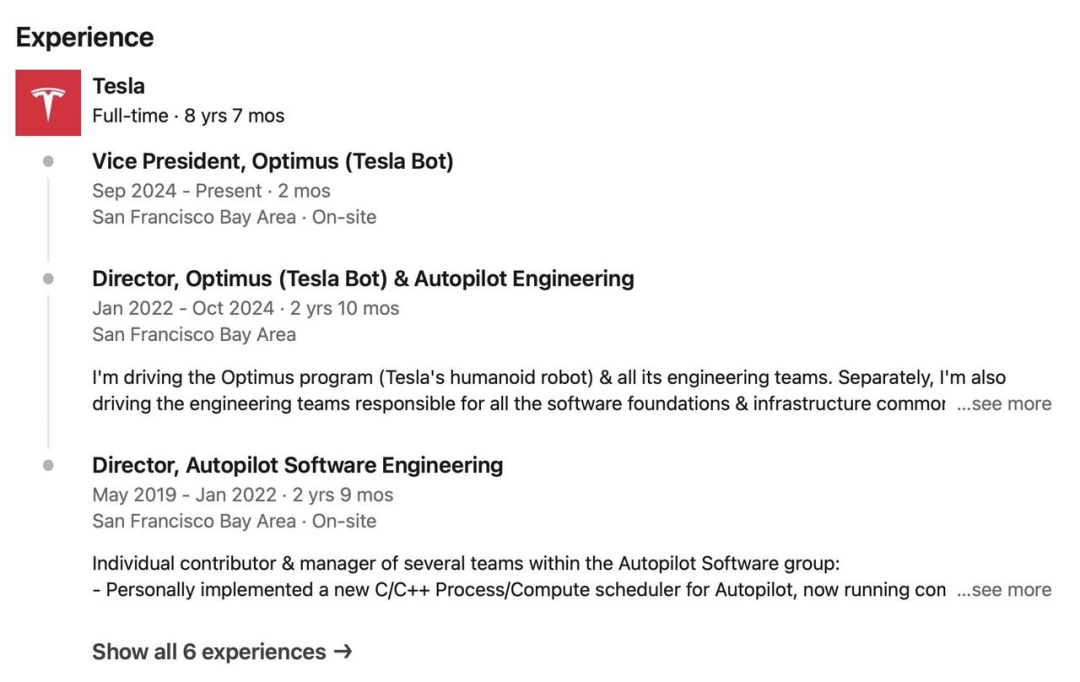 2017年,Ashish从职场重返校园,开始到UC伯克利攻读博士,2023年7月他以ML科学家的身份加入特斯拉,一年多之后便成为擎天柱的AI负责人。