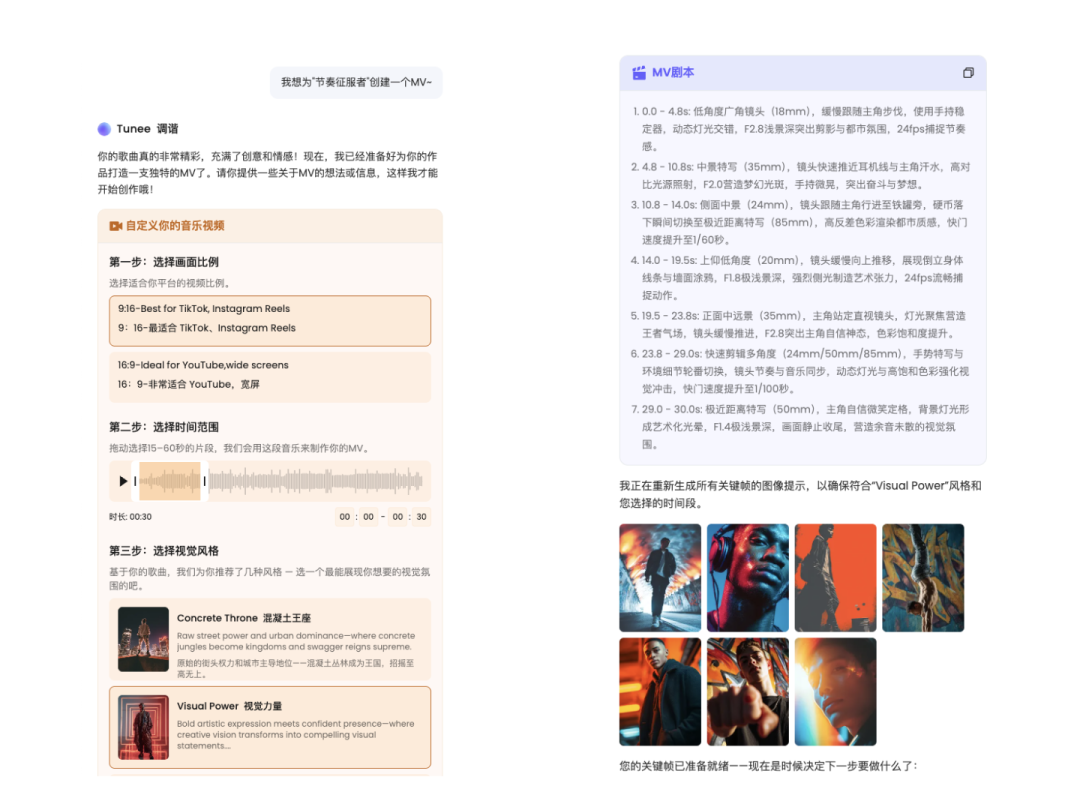 我给demo2下了个“生成 MV”的指令,Tunee立刻反问我想要的画面比例、时长和视觉风格,选项给得很全,甚至还顺带写个MV剧本,这确实牛了点。