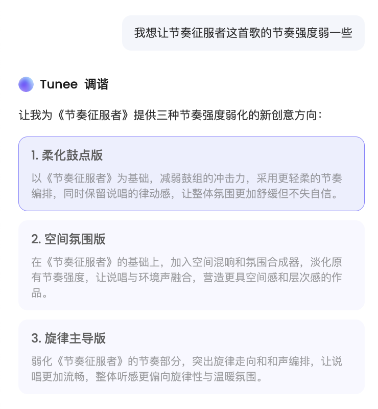 接着为了更好地测评Tunee对语义的理解及音乐处理能力,我试着让AI试着把demo2的节奏弱化一些: