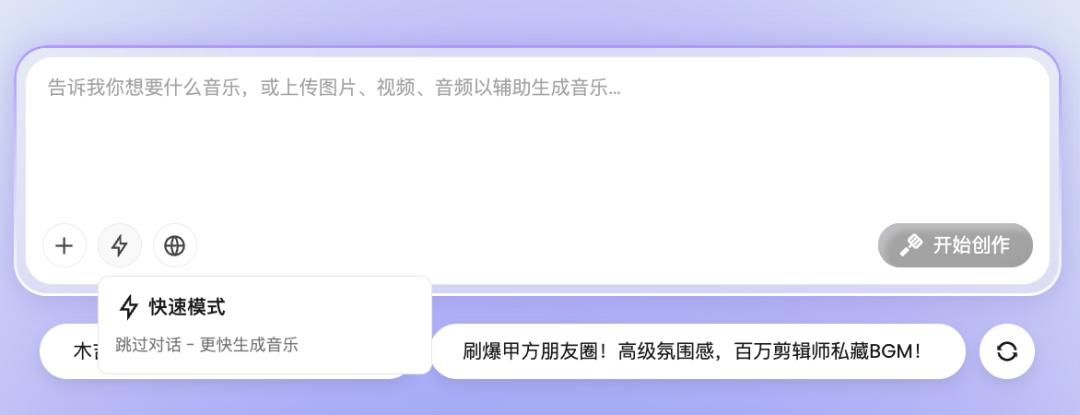 不仅能上传文件、联网搜索获取灵感,甚至还有一个“快速模式”能让你跳过对话,一键出歌。