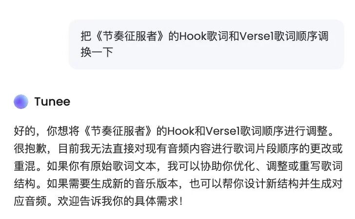 Suno是那种“投一次硬币看命运”的模式,提交提示词后,成品不太可控,而Tunee把音乐生成做成了一场可以反复修改的对话。你可以像和真人制作人沟通一样,不断对生成结果提出修改意见。