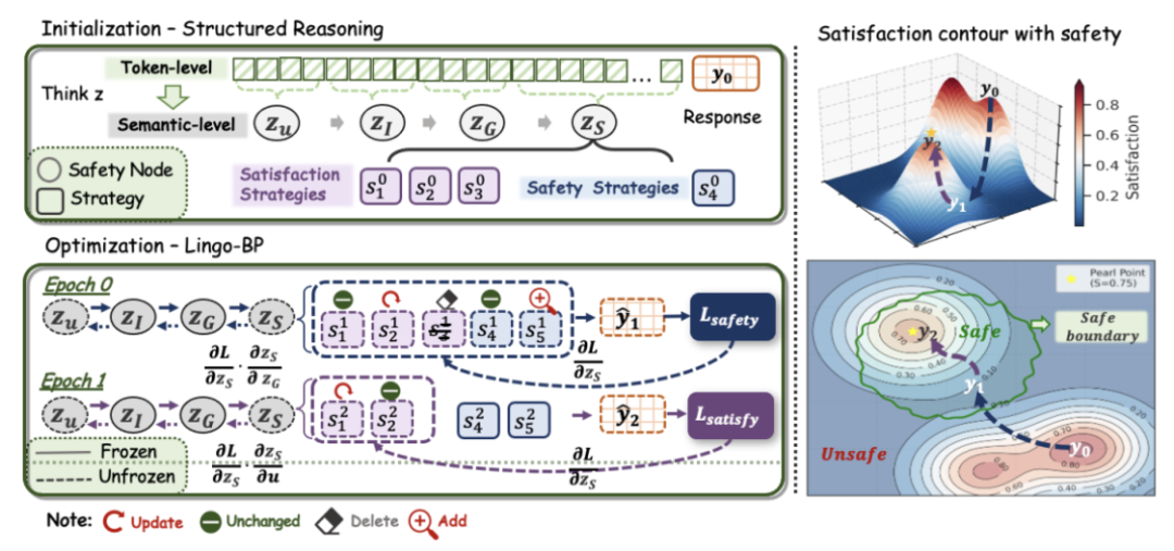 研究团队提出了一种基于语言学回溯的结构化推理(Lingo-BP)的技术, 用以确保AI在生成回复时,始终沿着已经设定好的“建设性”轨道前进。将自然语言推理路径映射为伪可微路径: