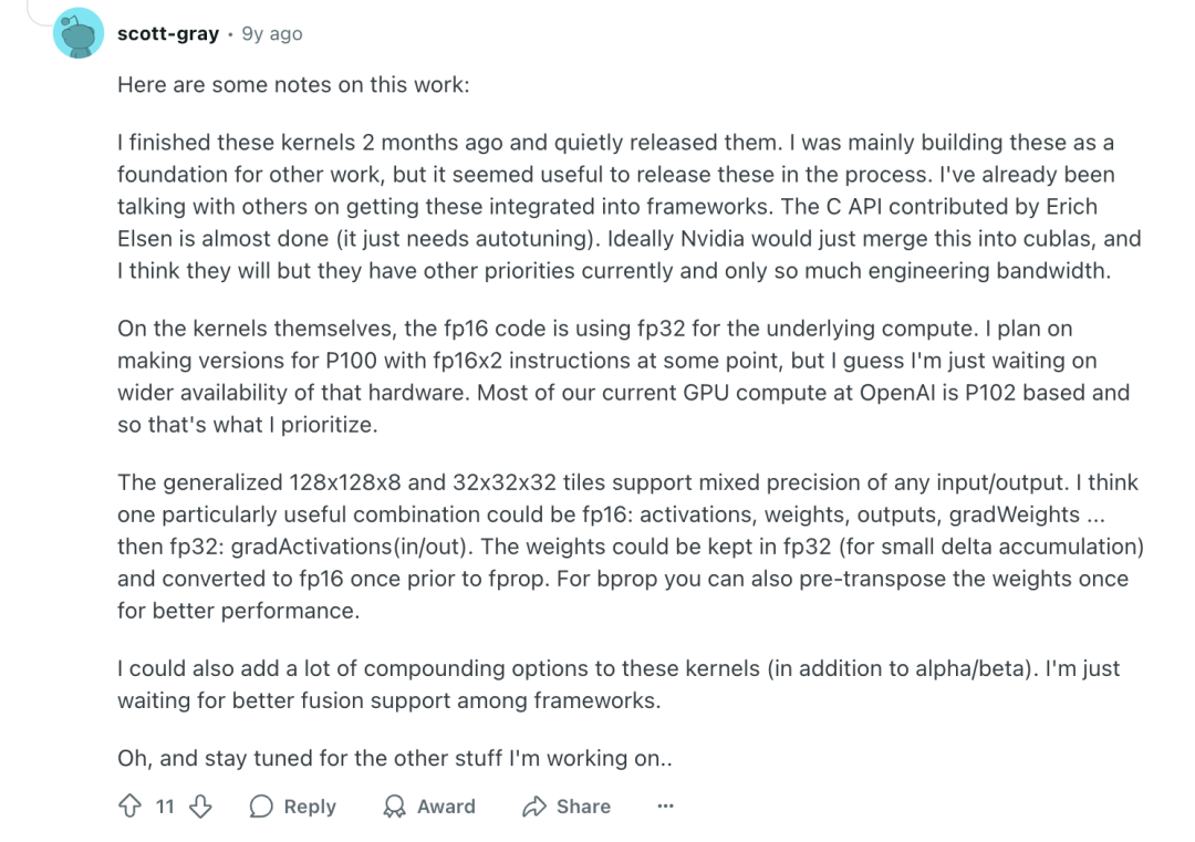 2017年,Scott在Reddit上事无巨细地全盘托出了自己是怎么在OpenAI搭建的CUDA内核,包括FP16/FP32计算优化和针对P100/P102 GPU的适配。